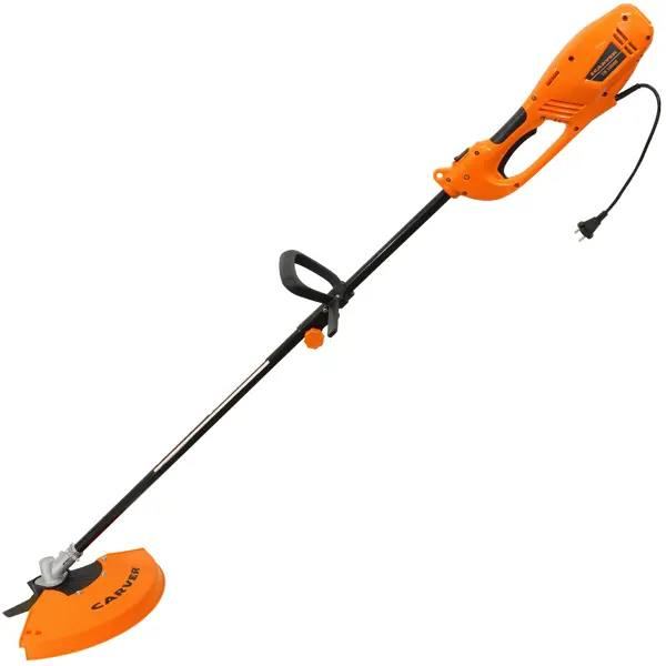 **Триммер электрический CARVER TR-1500S** — удобная электрокоса для травы и мелких кустарников. На одном конце разъемной металлической штанги располагается режущий элемент, закрытый защитным кожухом. В качестве рабочей насадки используется либо дисковый нож, либо кассета с леской. На другой стороне находится эргономичная рукоятка велосипедного типа, оснащенная клавишами включения/выключения и блокировки. Здесь же закреплен электродвигатель мощностью 1200 Вт. **Особенности** - Скорость вращения рабочей насадки достигает 10 000 об/мин. - При необходимости леску в катушке можно заменить аналогом диаметром 2,4 мм. - Триммер укомплектован ремнем для дополнительной фиксации на плече. - Для работы требуется стандартная электросеть 220 В и удлинитель. **Эксплуатация** Система плавного пуска позволяет избежать преждевременного износа электромотора. Двигатель под нагрузкой должен работать на максимальных оборотах. В холостом режиме производительность нужно снижать до минимума.