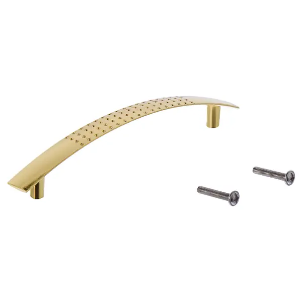 **Ручка-скоба** выполнена в стиле «неоклассика» и украшена простым узором, декорирующим саму деталь, но не привлекающим лишнего внимания. Удобная изогнутая форма хорошо гармонирует с любым типом мебели. Основной материал изделия — металл. Поверхность имеет декоративное полированное покрытие золотистого цвета. Ручка-скоба длиной 158 мм фиксируется на лицевой части мебели винтами длиной 22,5 мм, расстояние между крепежными отверстиями составляет 128 мм. Обратите внимание: крепление в комплекте. ### Достоинства - Быстрый и легкий монтаж обеспечивает надежное крепление детали в двух точках. - Материал изделия прочен, долговечен, устойчив к истиранию и воздействию влаги. - Эргономичная форма позволяет с комфортом открывать дверцы и выдвигать ящики.