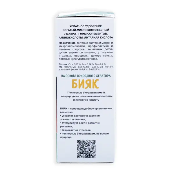**Удобрение «Богатый-9» микроэлементы 0.1 л** - минеральное микроудобрение для обогащения урожая микроэлементами, профилактики и лечения хлорозов. **Состав:** N – 1,6%, Fe – 0,4%, Cu – 0,12%, B – 0,028%, Mn – 0,36%, Zn – 0,09%, Mg – 0,05%, Mo – 0,08%, Co – 0,016% в хелатной (легкоусвояемой растениями) форме. **Преимущества:** - Экономный расход: 12 мл на 10 л воды. - Подходит для стимуляции семян при замачивании перед посевом. - Препарат полностью безопасен и не имеет срока ожидания. **Назначение:** Богатый-Микро Комплексный разработан для обогащения урожая микроэлементами, профилактики и лечения всех видов хлорозов, вызванных дефицитом элементов питания у плодово-ягодных, овощных, декоративных, полевых культур и винограда. **Класс опасности:** 3.