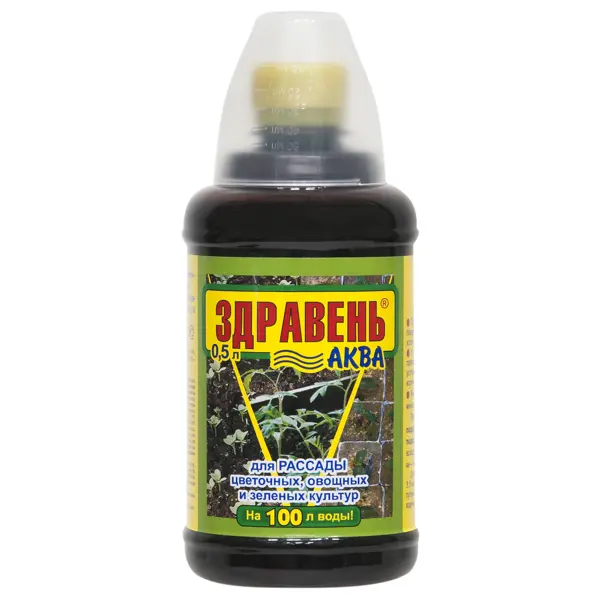 **Удобрение «Здравень Аква» для рассады** — жидкий концентрат органических и минеральных веществ для прикорневой подкормки и опрыскивания рассады овощей, декоративных и зеленых культур. Ускоряет рост рассады, способствует ее приживаемости при высадке в грунт, улучшает формирование здоровой корневой системы. Повышает устойчивость растений к болезням.