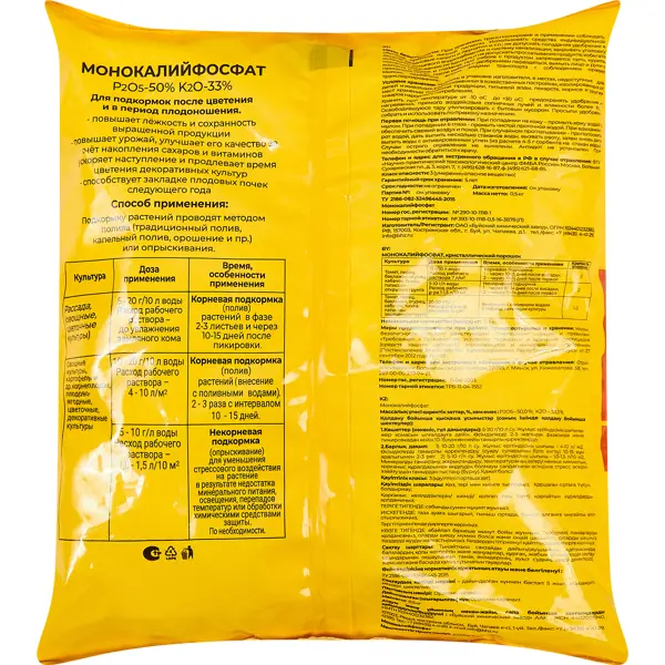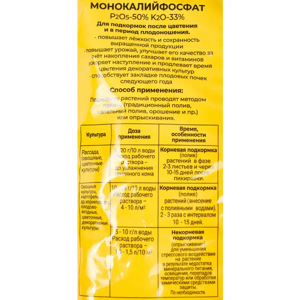 **Удобрение «Монокалийфосфат»** применяют для подкормки всех видов садовых и огородных культур. Растворяется в воде, затем используется для полива и опрыскивания растений. ### Особенности - Увеличивает урожайность плодовых растений. - Способствует накапливанию витаминов и сахаров в плодах. - Улучшает внешний вид цветов, продлевают период цветения.