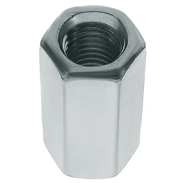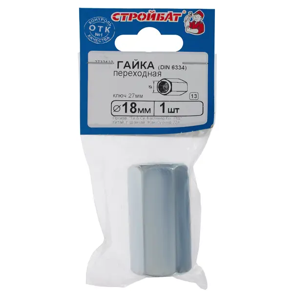 **Гайка переходная DIN 6334 M18** — крепежная деталь, предназначенная для соединения резьбовых шпилек и штифтов. Другие названия метиза — удлинительная, удлиняющая, длинная. Используется для соединения деталей в промышленности, приборостроении, строительстве. Соединение осуществляется с помощью гаечного ключа. ### Особенности крепежа - При соединении двух шпилек их концы должны располагаться точно посередине соединяющей гайки. В процессе монтажных работ при необходимости от гайки отрезают куски нужной длины, для усиления прочности соединения на концах накручивают контргайки. - Резьба диаметром 18 мм. Длина гайки равна трем диаметрам резьбы. - В упаковке 1 штука. - Гайки изготавливаются из углеродистой стали и защищаются с помощью цинкового покрытия, предохраняющего от коррозии.