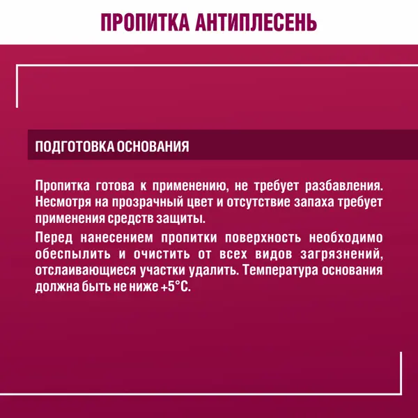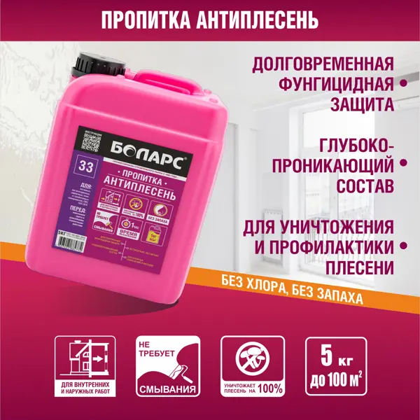 Пропитка БОЛАРС Антиплесень – высокоэффективный состав, который можно применять как для надежного уничтожения уже имеющихся плесени и грибка, так и для предотвращения их роста. Пропитка глубоко проникает в поры основания и обеспечивает долговременную фунгицидную защиту. Важная характеристика пропитки: отсутствие неприятного запаха, т.к. в составе нет хлора. Не требует смывания. Применяется на фасадах зданий и внутри помещений с любым уровнем влажности. Одной канистры 5 л хватит для обработки 50-100 кв.м поверхности. Несмотря на прозрачный цвет и отсутствие запаха, содержит высокоэффективные противоплесневые компоненты, требует применения средств индивидуальной защиты при проведении обработки поверхности. **Не заменяет грунт!** - Для уничтожения плесени состав наносится локально на пораженную область кистью или валиком. Через 6-12 часов поверхность зачищается механически (шпателем, щеткой или струей пара. После высыхания поверхности Антиплесень наносится повторно. Дальнейшие отд
