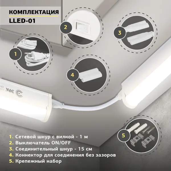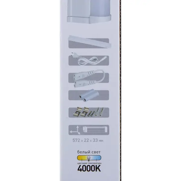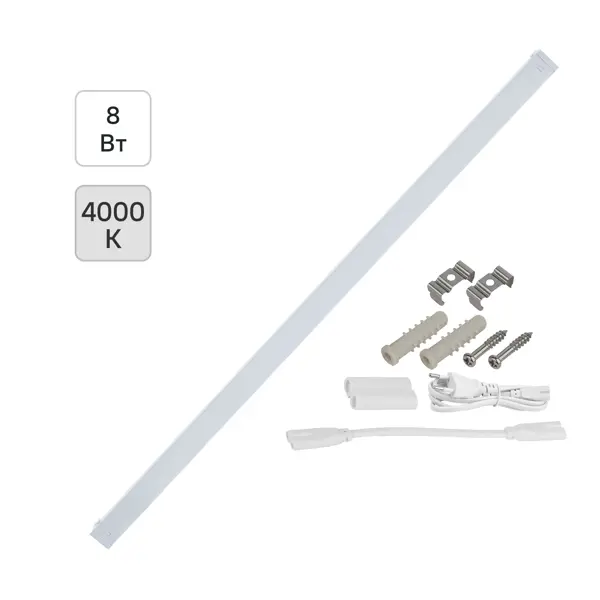 **Светильник светодиодный** — компактное устройство для подсветки, дополнительного освещения и декорирования помещений. Прибор имеет минималистичное оформление. Прост в монтаже. Светодиодные лампы обеспечивают длительный срок бесперебойной работы (до 30 000 часов), редко выходят из строя и безопасны при повреждении. Потребляют очень мало энергии. **Светильник линейный светодиодный с выключателем ЭРА LLED-01-08W-4000-W** с матовым рассеивателем, обеспечивает равномерный заливающий свет без пульсаций и слепящего эффекта. **В комплекте:** светильник; сетевой шнур с вилкой длиной 1м; соединительные элементы для последовательного подключения: коннектор жесткий для соединения встык, коннектор гибкий 15см; монтажный комплект: скобы для крепления к поверхности, винты и дюбеля; инструкция по применению. Светильник может быть подключен в линию суммарной мощностью до 100Вт, в т. ч. с применением модулей с датчиком движения ЭРА LLED-02. Предназначен для освещения рабочей поверхности кухни, шк