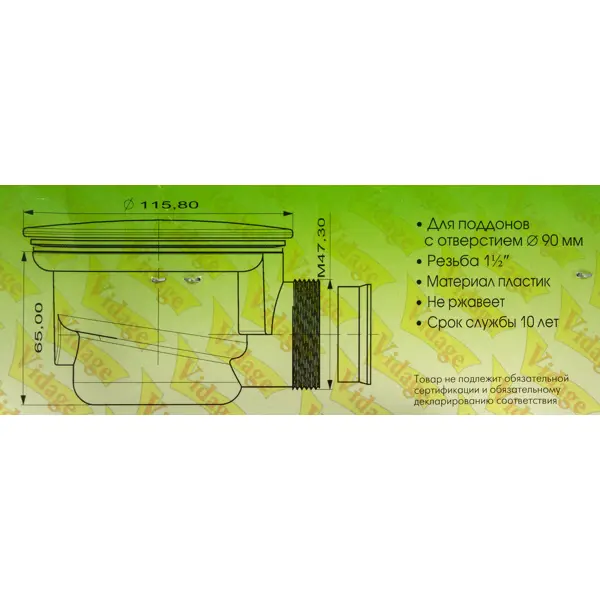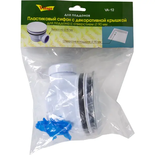 **Сифон для душевого поддона Vidage** — элемент водосливной арматуры, который используется для отвода воды в канализационную сеть и выполняет функции гидрозатвора: препятствует проникновению неприятных запахов и токсичных газов из канализации в помещение. Сифон с металлическим выпуском. Подходит для поддонов с диаметром отверстия 90 мм. Страна производства товара — Россия.