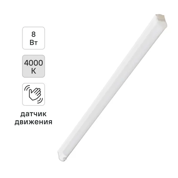 **Светильник линейный светодиодный** — лаконичный в оформлении осветительный прибор для подсветки отдельных зон в помещении. Прост в установке. Подходит для кухонных шкафов, полок, ниш, оформления декоративных объектов. Позволяет не использовать основное освещение, так как дает достаточно яркий свет. Светильник состоит из корпуса и светодиодов. Лампочки полностью закрыты от внешнего воздействия. Светодиоды безопасны в эксплуатации и долговечны, помогают экономить электроэнергию. ### Другие особенности прибора - Бесконтактное включение обеспечивает комфорт при использовании устройства. - Потребляемая мощность лампочки из комплекта — 8 Вт. - Цветовая температура — 4000 К. **БЕРЕЖНО К ЛЮДЯМ, БЕРЕЖНО К ПРИРОДЕ** - Светильники и лампы с классом энергоэффективности A и выше потребляют меньше энергии* при той же яркости, что снижает расходы на электричество и помогает бережнее относиться к природным ресурсам. Благодаря долгому сроку службы такое освещение не требуют частой замены и экон