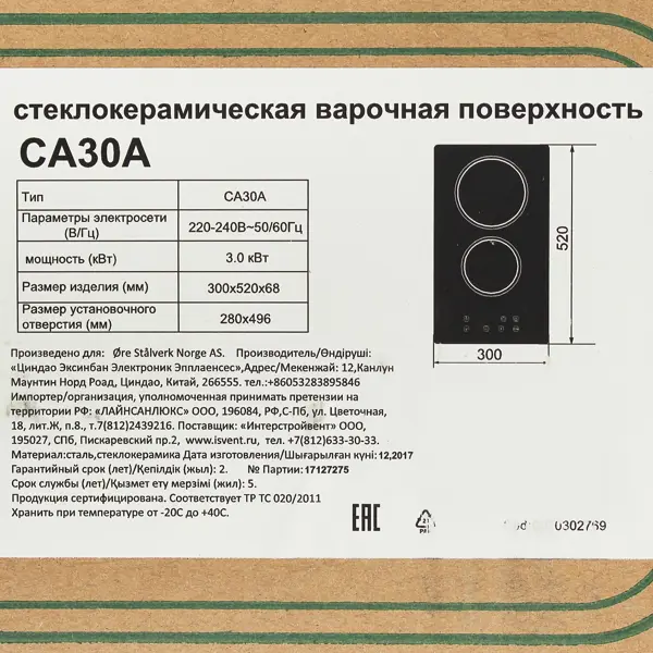 | Материал поверхности | Стеклокерамика |