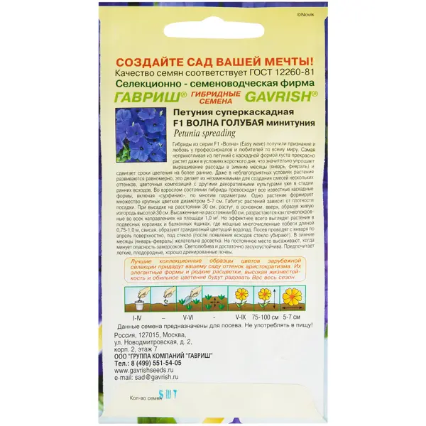 **Петуния «Волна голубая» F1 (минитуния)** — неприхотливый каскадный однолетник с большими голубыми цветами диаметром до 7 см. Форма куста зависит от способа посадки. В кашпо формируются плети до 1 м, в открытом грунте куст растет в высоту на 30-60 см, покрывая до 1 м2 площади. Посев семян — с января. ### Преимущества