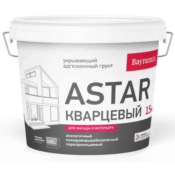 **Укрывающий грунт Bayramix Astar Кварцевый** – адгезионный грунт на основе акриловых полимеров с добавлением кварцевого наполнителя предназначен для улучшения адгезии (сцепления) и цветового выравнивания поверхности перед нанесением финишных декоративных материалов (мраморные штукатурки, фактурные покрытия). Подходит для наружных и внутренних работ. Используется для подготовки поверхностей из бетона, кирпичной кладки, гипсокартонных панелей, цементной штукатурки, других минеральных, а также деревянных поверхностей. **Свойства:** - Практически без запаха - Не содержит растворителей - Пожаро- и взрывобезопасен - Образует прочное паропроницаемое покрытие - Уменьшает расход краски - Экономичен при использовании **Подготовка основания:** Основание необходимо очистить от загрязнений, отслаивающихся частиц, а также жирных и масляных пятен. Неровности и трещины зашпаклевать. Для укрепления и уменьшения впитывающей способности поверхности обработать грунтом глубокого проникновения Primer