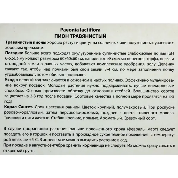 **Пионы травянистые «Корал Сансет»** отличаются полумахровыми ароматными соцветиями, меняющими цвет от кораллового при роспуске к персиковому и бежево-молочному в конце цветения. Цветок чашевидный, незаполненный в середине. Диаметр — 20 см. Высота куста — 80-120 см. Растение предпочитает солнечные или слегка затененные участки, требует полива и подкормок. На одном месте может расти десятилетиями. Зеленая масса не желтеет все лето.