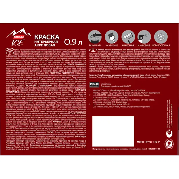**Внимание!** База А содержит белый пигмент, может использоваться самостоятельно как белая краска и для создания пастельных оттенков. **Краска для стен Parade DIY Intensive** с оптимально подобранным составом позволяет получить высоко декоративный результат при окрашивании поверхности, создает матовое бархатистое покрытие и визуально маскирует дефекты основы. Создает прочное покрытие, выдерживающее легкую уборку влажной тряпкой. Подходит для шпатлеванных и оштукатуренных, гипсокартонных, бетонных, кирпичных, фанерных, ДСП, ДВП, древесины, а также поверхностей, ранее окрашенных водно-дисперсионными и алкидными ЛКМ. **Особенности** - высокая укрывистость - быстрое высыхание - отсутствие выраженного запаха в процессе окрашивания - удобна в использовании - равномерно наносится и распределяется, не оставляя стыков даже при работе на больших площадях **Подготовка поверхности** Окрашиваемая поверхность должна быть сухой и чистой. При необходимости удалить остатки непрочно держащегося п