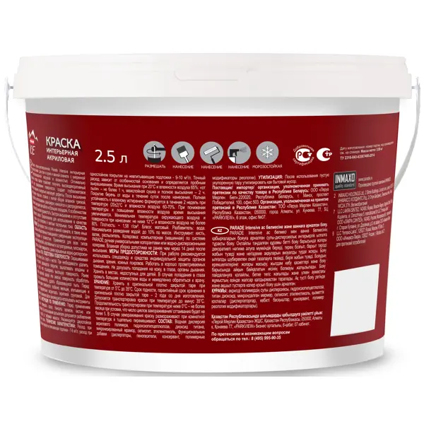 **Внимание!** База А содержит белый пигмент, может использоваться самостоятельно как белая краска и для создания пастельных оттенков. **Краска для стен Parade DIY Intensive** с оптимально подобранным составом позволяет получить высоко декоративный результат при окрашивании поверхности, создает матовое бархатистое покрытие и визуально маскирует дефекты основы. Создает прочное покрытие, выдерживающее легкую уборку влажной тряпкой. Подходит для шпатлеванных и оштукатуренных, гипсокартонных, бетонных, кирпичных, фанерных, ДСП, ДВП, древесины, а также поверхностей, ранее окрашенных водно-дисперсионными и алкидными ЛКМ. **Особенности** - высокая укрывистость - быстрое высыхание - отсутствие выраженного запаха в процессе окрашивания - удобна в использовании - равномерно наносится и распределяется, не оставляя стыков даже при работе на больших площадях **Подготовка поверхности** Окрашиваемая поверхность должна быть сухой и чистой. При необходимости удалить остатки непрочно держащегося п