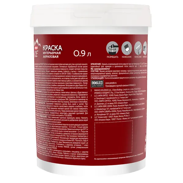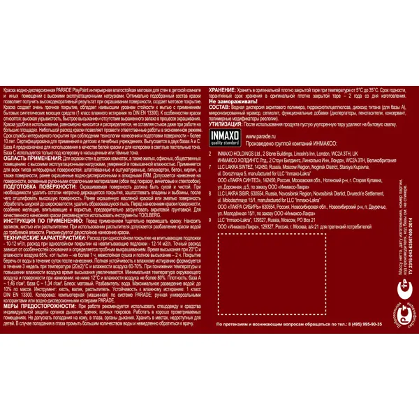**Внимание!** Базы BC; C; 3; D; ВМ — прозрачная краска, не имеющая в составе пигментов, используется только для колеровки в яркие, насыщенные цвета. **Краска для стен и потолков Parade «Diy 7 PlayPaint»** — состав на водной основе для финишной отделки внутри любых жилых помещений. Подходит для колеровки с универсальными красителями. Краска не имеет запаха. Время высыхания при 20°С и влажности воздуха 65%: "от пыли" - не более 1 ч, межслойная сушка и полное высыхание - 2 ч. Покрытие беречь от воды в течение суток после нанесения. Полная устойчивость к влажному истиранию формируется в течение 3 недель при температуре 20(±2)°С и влажности воздуха 60-70%. При понижении температуры и повышении влажности воздуха время высыхания увеличивается. Минимальная температура окружающего воздуха и поверхности при нанесении: не нижу 12°С и влажности воздуха не более 80%. Готовое покрытие матовое, поверхность суперчистящаяся. **Уважаемые клиенты, колерованная краска надлежащего качества возврату и обм