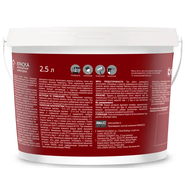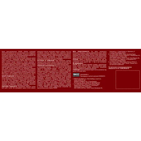 **Внимание!** Базы BC; C; 3; D; ВМ — прозрачная краска, не имеющая в составе пигментов, используется только для колеровки в яркие, насыщенные цвета. **Краска для стен и потолков Parade «Diy 7 PlayPaint»** — состав на водной основе для финишной отделки внутри любых жилых помещений. Подходит для колеровки с универсальными красителями. Краска не имеет запаха. Время высыхания при 20°С и влажности воздуха 65%: "от пыли" - не более 1 ч, межслойная сушка и полное высыхание - 2 ч. Покрытие беречь от воды в течение суток после нанесения. Полная устойчивость к влажному истиранию формируется в течение 3 недель при температуре 20(±2)°С и влажности воздуха 60-70%. При понижении температуры и повышении влажности воздуха время высыхания увеличивается. Минимальная температура окружающего воздуха и поверхности при нанесении: не нижу 12°С и влажности воздуха не более 80%. Готовое покрытие матовое, поверхность суперчистящаяся. **Уважаемые клиенты, колерованная краска надлежащего качества возврату и обм