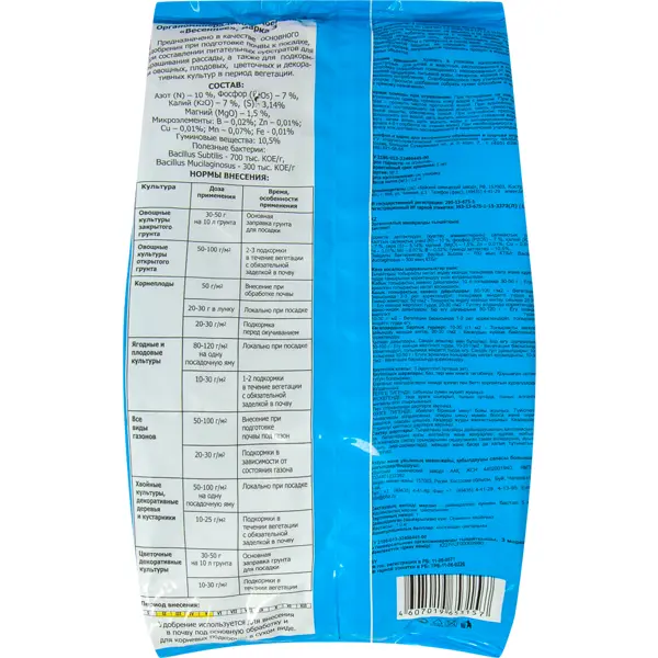 | Состав | (N)-10 %; (P2O5 )-7 %; (К2О)-7 %; (MgO)-1,5%; В-0,02%;Zn-0,01%; Mn-0,07%; Сu-0,01%; Fe-0,01% гум.кислот-10,5% |