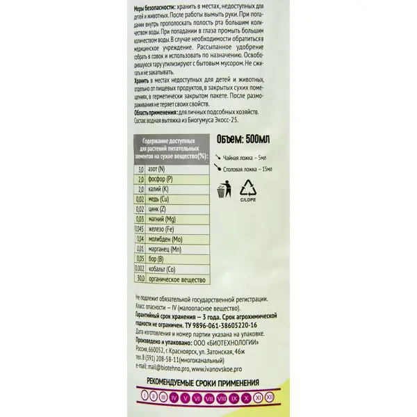 - Возможно использование в сельском хозяйстве. ### Меры предосторожности Данное удобрение не требует соблюдения специфических правил техники безопасности. После использования вымойте руки. При попадании внутрь нужно прополоскать полость рта большим количеством воды. В случае необходимости обратиться в медицинское учр