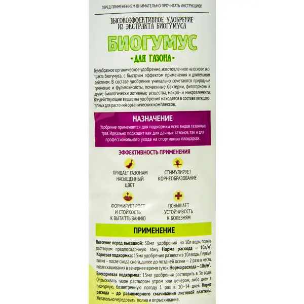 **Удобрение Садовые рецепты «Биогумус»** — концентрированное органическое средство для стимуляции роста растений. Применяется для газона. Уникальное сочетание микроэлементов, бактерий и биологически активных веществ способствует улучшению качественных характеристик почвы, повышает сопротивляемость растений болезням и обеспечивает их правильное развитие. Благодаря гелеобразной форме все питательные вещества, находящиеся в составе, легко усваиваются растениями. ### Особенности