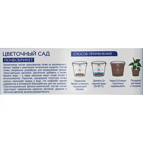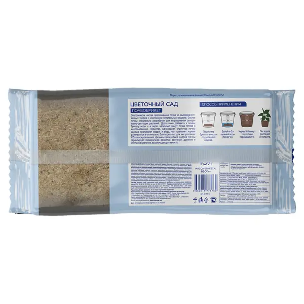 **Почвобрикет БиоМастер «Цветочный сад»** — состав для выращивания декоративных садовых и комнатных растений. В составе почвосмеси — торф, вермикулит и необходимые для роста и развития растений питательные элементы: фосфор, азот, калий, цинк, железо. Брикет разводится в 4 л теплой воды, увеличиваясь в объеме до 10 л готового грунта. Страна производства товара — Россия. ### Преимущества - Улучшает декоративные качества цветов. - Повышает устойчивость к болезням. - Увеличивает продолжительность цветения. - Термическая обработка состава исключает содержание в грунте болезнетворных бактерий, грибков и вредных микроорганизмов. **БЕРЕЖНО К ЛЮДЯМ, БЕРЕЖНО К ПРИРОДЕ** - Приобретая натуральные удобрения, вы выбираете не только лучшее питание для растений, но и способствуете восстановлению плодородия почвы, улучшаете её структуру, влагоемкость и стимулируете деятельность полезной микрофлоры. Его использование исключает риск химических ожогов корней и накопления нитратов в продукции, а также с