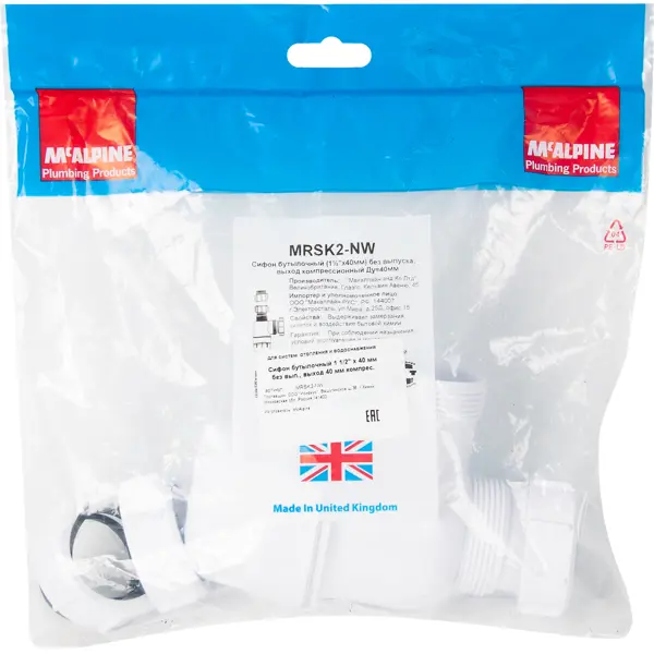 **Сифон для мойки McAlpine** используется для кухонной мойки. Он предназначен для отведения в канализационную систему воды и защищает от появления неприятных запахов. Регулируемый по высоте сифон подходит для раковин с уже оборудованным выпуском. Он обеспечивает надежное, простое и удобное подключение. ### Особенности: - белый цвет; - бутылочный вид; - максимальная высота монтажа — 22 см; - диаметр выхода в канализационную систему — 40 мм; - без выпуска; - диаметр отверстия для слива — 1 1/2"; - вертикальное расположение; - мокрый вид затвора.