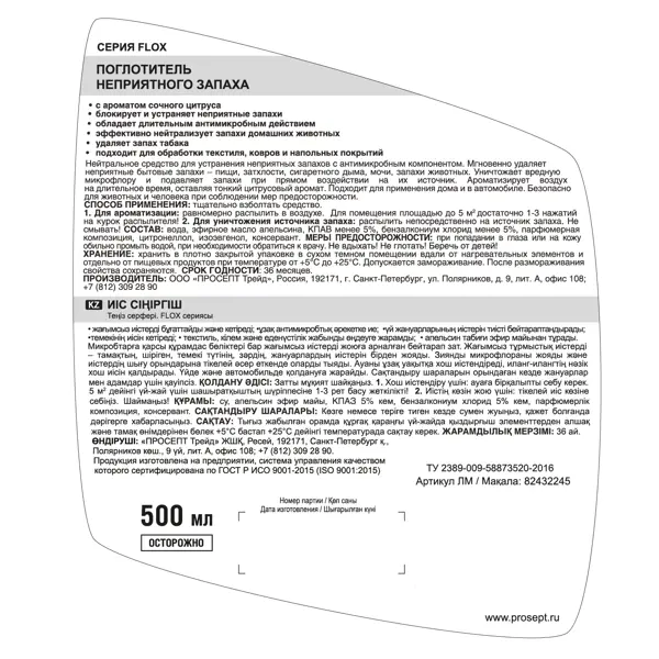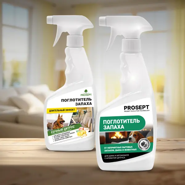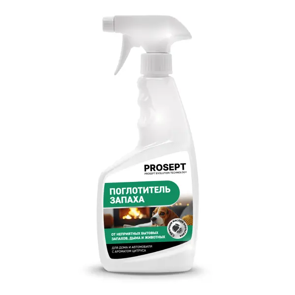 **Поглотитель запаха Prosept «Сочный цитрус»** с антимикробными компонентами. Спрей удаляет неприятные бытовые запахи: пищи, затхлости, сигаретного дыма, мочи, запахи животных. Уничтожает вредную микрофлору и подавляет запахи при прямом воздействии на их источник. Ароматизирует воздух на длительное время. **Преимущества:** - блокирует и устраняет неприятные запахи; - подходит для применения дома и в автомобиле; - безопасен для людей и животных при соблюдении мер предосторожности; - подходит для устранения неприятных запахов с текстиля, ковров и мебели. **Способ применения:** - Тщательно взболтать средство. - Для ароматизации равномерно распылить в воздухе. Для помещения площадью до 5 м² достаточно 1-3 нажатий на курок распылителя. - Для уничтожения источника запаха: распылить непосредственно на источник запаха. Не смывать. **Состав:** вода, эфирное масло апельсина, КПАВ менее 5%, бензалкониум хлорид менее 5%, консервант.