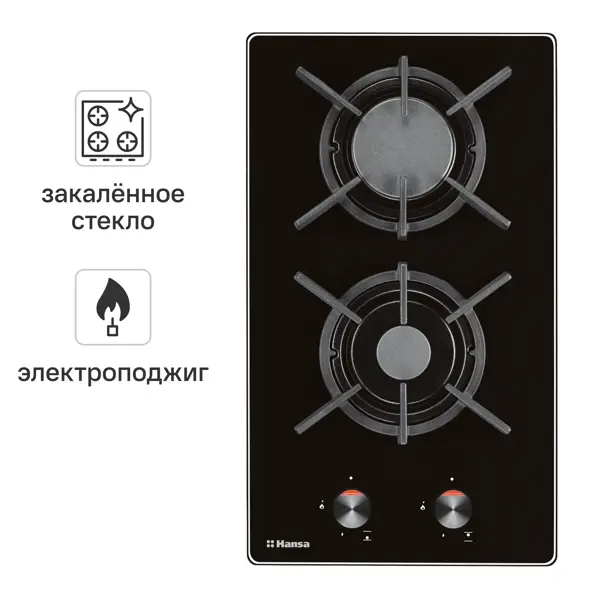 **Газовая варочная панель Hansa BHKS330500** - компактное встраиваемое кухонное оборудование. Рабочая поверхность изготовлена из закаленного стекла, что обеспечивает долговечность и простоту ухода за прибором. ### Особенности: - благодаря своим компактным габаритам предназначена для установки на кухнях любого размера, идеально подходит для небольших кухонь или помещений, где требуется экономия пространства; - в конструкции предусмотрены две стандартные конфорки разного диаметра: малая 5,3 см и большая 9,8 см, что позволяет готовить в различной посуде; - управление осуществляется с помощью поворотных переключателей, расположенных спереди; - наличие автоматического электроподжига делает использование панели максимально удобным - конфорки зажигаются одним движением; - система газ-контроль обеспечивает безопасность, автоматически перекрывая газ при случайном погасании пламени; - панель оснащена чугунными решетками, которые отличаются прочностью и устойчивостью к перепадам температуры, мех