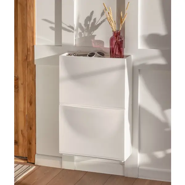 **Обувница «Эконова»** — приспособление для удобного хранения обуви. Предназначена для установки в прихожей, но также может использоваться в гостиной или спальне для хранения мелочей. Изготовлена из прочного пластика. Модель оснащена задней стенкой и откидным лотком. Для хранения можно использовать как внутреннее пространство, так и верхнюю полку с углублением. Размер обувницы — 512 × 185 × 380 мм. Цвет модели — белый, покрытие матовое. Нейтральный оттенок позволяет вписать обувницу в любую цветовую гамму интерьера. Страна производства — Россия. ### Преимущества: - Не впитывает грязь и пыль, не нуждается в специальном уходе, достаточно влажной уборки; - Устойчива к прямому контакту с водой; - Дверца защищена от самопроизвольного открывания специальным ограничителем.