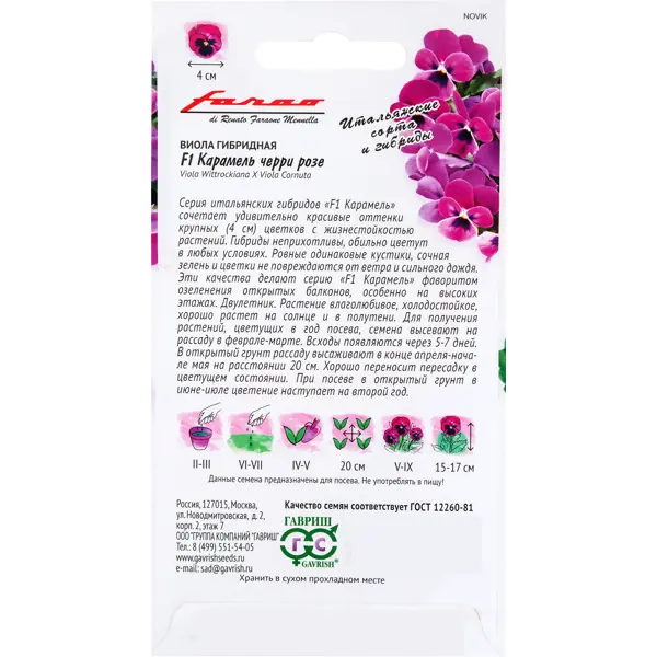 **Виола «Карамель Черри Розе» F1** — декоративный гибрид высотой 15-17 см. Формирует кустики с сочной зеленой листвой и яркими цветами до 4 см в диаметре, окрашенные в ярко-розовые тона. Цветет интенсивно с мая по сентябрь. Растение устойчиво к повреждениям от дождя и ветра, идеально подходит для декора балконов на верхних этажах. ### Особенности сорта