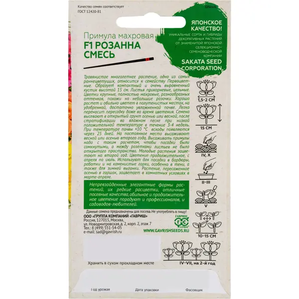 **Примула махровая «Розанна» F1** — раннецветущий декоративный многолетник. Формирует невысокие (до 15 см) выровненные травянистые кустики с крупными цветами, напоминающими розы различной окраски. Культура выращивается в бордюрах, на рабатках и альпийских горках, используется для зимней выгонки. Цветет на второй год в течение апреля-июля.