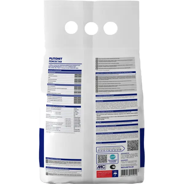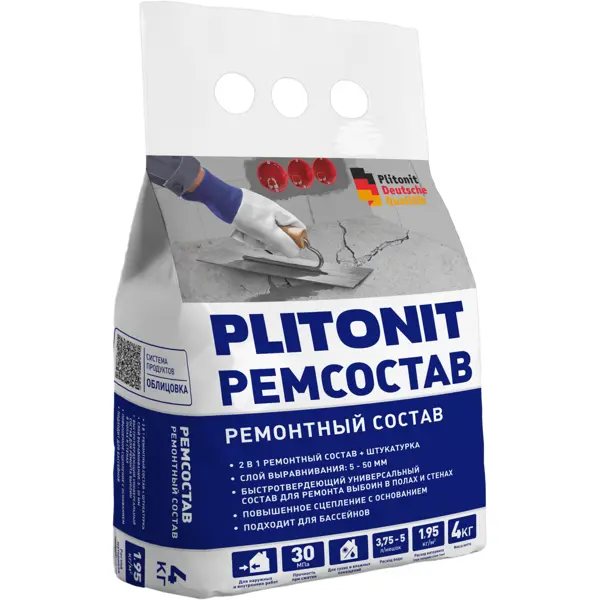 **Ремонтный состав универсальный Plitonit** применяется при проведении внутренних и внешних работ. Позволяет заделать выбоины, трещины и сколы в стенах, ступенях или полу. Подходит для обработки кирпичных и бетонных оснований. Перед нанесением поверхность следует очистить от пыли, мусора и грязи и немного смочить (без образования луж). Дополнительную прочность придает армирование волокнами. Может наноситься слоем от 5 до 55 мм. ### Особенности: - отличается высокой адгезией; - обработанную поверхность можно подвергать эксплуатации уже через 3 часа; - инструкция по приготовлению раствора представлена на упаковке; - вес — 4 кг.