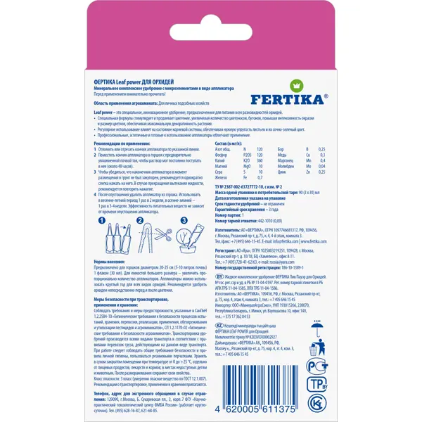 **Удобрение «Фертика» LeafPower для орхидей** — инновационное комплексное минеральное средство с микроэлементами, обеспечивает полноценное питание растений, раскрывает их декоративность. Улучшает состояние корневой и вегетативной системы, стимулирует образование цветков, увеличивает их количество и размер, повышает интенсивность окраски, пролонгирует период цветения. ### Особенности удобрения - Выпускается в виде аппликатора, рассчитанного на 5-10 л земли (цветочный горшок диаметром 20-25 см). - Пригодно для круглогодичного использования. - Подходит для всех видов орхидей. **БЕРЕЖНО К ЛЮДЯМ, БЕРЕЖНО К ПРИРОДЕ** - Приобретая натуральные удобрения, вы выбираете не только лучшее питание для растений, но и способствуете восстановлению плодородия почвы, улучшаете её структуру, влагоемкость и стимулируете деятельность полезной микрофлоры. Его использование исключает риск химических ожогов корней и накопления нитратов в продукции, а также снижает нагрузку на водоёмы.