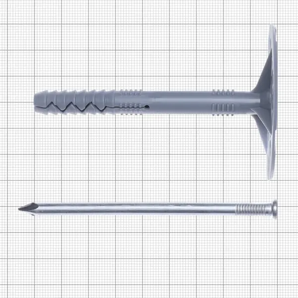 **Дюбель для теплоизоляции** применяется при монтаже легких и тяжелых теплоизоляционных материалов к полнотелым основаниям — бетону, кирпичу, природному камню. Подходит для механического крепления фасадных конструкций из пенополистирола, минеральной и стеклянной ваты, слоистых плит, полистирола, пенопласта, пеноплэкса, полиуретана. Материал — пластик. Распорный металлический гвоздь прилагается. Длина изделия — 90 мм, количество в упаковке — 250 шт. ### Особенности - Фиксируется в основании путём высверливания 10-миллиметрового отверстия с глубиной на 0,5-1 см больше длины дюбеля и забиванием распорного гвоздя. - Запрещено применение в стенах с трещинами, сколами и сильными загрязнениями. - Используется при монтаже термоизоляции на жилых и промышленных сооружениях. - Подходит для стен, подвергающихся неблагоприятному атмосферному воздействию.