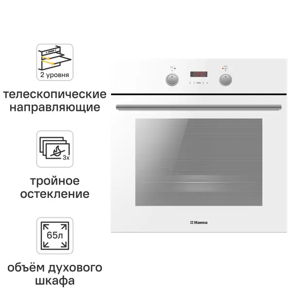 **Электрический духовой шкаф Hansa BOEW68433** представляет собой современное встраиваемое решение для приготовления пищи в домашних условиях. Комплектация включает два противня, решетку для жарки и необходимые аксессуары для комфортного использования. Хромированные направляющие и качественная фурнитура придают шкафу премиальный внешний вид. ### Особенности: - прибор выполнен в элегантном белом цвете; - имеет компактные габариты 59,5 х 59,5 х 57,5 см; - объем рабочей камеры составляет 65 л, что позволяет готовить как небольшие порции, так и большие блюда для всей семьи; - предусмотрено 8 режимов нагрева, среди которых гриль, конвекция, верхний и нижний нагрев; - благодаря функции быстрого предварительного нагрева, температура 150°C достигается всего за 4 минуты, что существенно экономит время приготовления; - дисплей с часами и сенсорные кнопки в сочетании с утапливаемыми поворотными переключателями обеспечивают простоту эксплуатации и ухода за прибором; - телескопические направляющи
