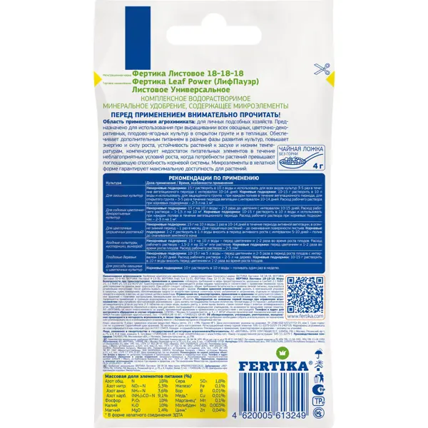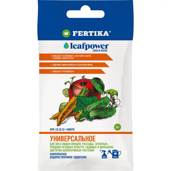 **Удобрение листовое универсальное «Фертика» LeafPower** — комплексное средство на основе азотно-фосфорно-калийной смеси, обогащено микроэлементами в хелатной форме, удобной для растений. Рекомендовано для внекорневой подкормки всех цветочных и овощных культур, выращиваемых под открытым небом и в защищенном грунте. Может использоваться как прикорневое удобрение. ### Преимущества средства - Увеличивает энергию роста. - Обеспечивает растения дополнительными питательными веществами, необходимыми на всех этапах развития, в том числе при неблагоприятных условиях. - Повышает устойчивость к низким температурам и засухе. **БЕРЕЖНО К ЛЮДЯМ, БЕРЕЖНО К ПРИРОДЕ** - Приобретая натуральные удобрения, вы выбираете не только лучшее питание для растений, но и способствуете восстановлению плодородия почвы, улучшаете её структуру, влагоемкость и стимулируете деятельность полезной микрофлоры. Его использование исключает риск химических ожогов корней и накопления нитратов в продукции, а также снижает на