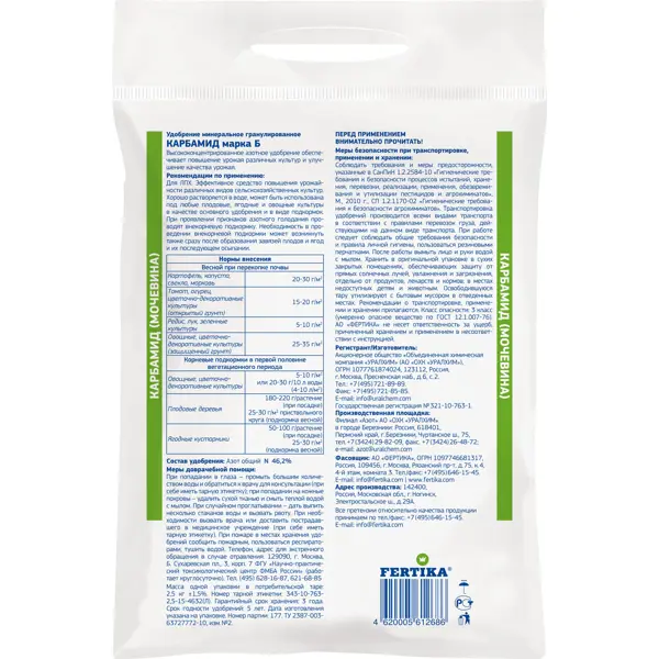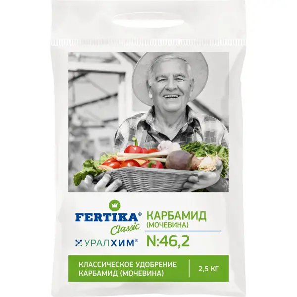 **Удобрение карбамид (мочевина) «Фертика Классик»** — гранулированное минеральное средство с высокой концентрацией азота. Рекомендовано для всех овощных и плодово-ягодных растений. Способствует росту урожайности и повышению качества плодов. Хорошо растворяется в воде. В сухом виде применяется как основное удобрение — весной при перекапывании грунта, в виде раствора — для корневых и внекорневых подкормок. **БЕРЕЖНО К ЛЮДЯМ, БЕРЕЖНО К ПРИРОДЕ** - Приобретая натуральные удобрения, вы выбираете не только лучшее питание для растений, но и способствуете восстановлению плодородия почвы, улучшаете её структуру, влагоемкость и стимулируете деятельность полезной микрофлоры. Его использование исключает риск химических ожогов корней и накопления нитратов в продукции, а также снижает нагрузку на водоёмы.