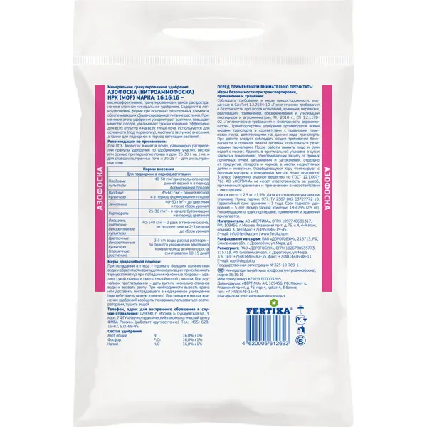 **Удобрение азофоска (нитроаммофоска) «Фертика Классик»** — гранулированное универсальное минеральное средство, содержит азот, фосфор и калий в оптимальной пропорции. Обеспечивает активное развитие всех типов растений, повышает урожайность, улучшает качество и пролонгирует срок хранения плодов. ### Особенности средства - Эффективно на любых почвах. - В сухом виде вносится при перекопке, добавляется в лунки, применяется для регулярной подкормки растений в процессе вегетации. - В виде раствора используется для удобрения горшечных культур в фазе активного роста. **БЕРЕЖНО К ЛЮДЯМ, БЕРЕЖНО К ПРИРОДЕ** - Приобретая натуральные удобрения, вы выбираете не только лучшее питание для растений, но и способствуете восстановлению плодородия почвы, улучшаете её структуру, влагоемкость и стимулируете деятельность полезной микрофлоры. Его использование исключает риск химических ожогов корней и накопления нитратов в продукции, а также снижает нагрузку на водоёмы.