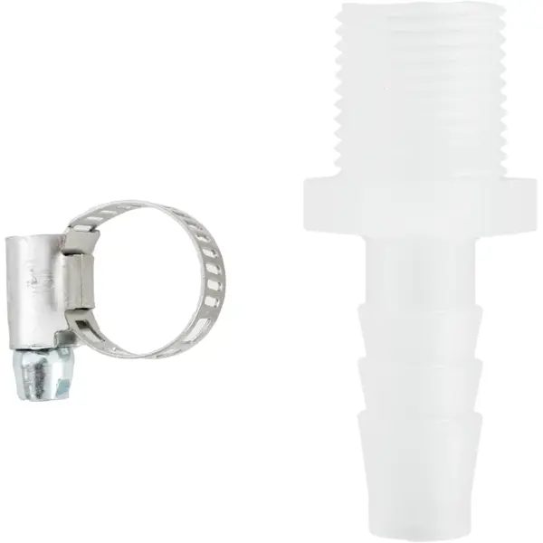 **Штуцер BOUTTE** — переходник для быстрого соединения шланга и трубы с резьбой. Может применяться для прокладки системы полива в саду, огороде или для технической системы подачи воды или воздуха. Изделие выполнено из белого пластика. С одной стороны имеет резьбу, с другой стороны — рифленый разъем для шланга диаметром 10 мм.