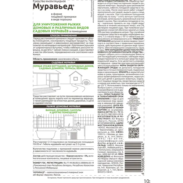 **Средство борьбы с муравьями Муравьед ЭКО** — состав на основе борной кислоты. Средство эффективно против домовых и садовых муравьев. В упаковке 50 г. ### Особенности средства - Пищевая приманка для насекомых. - Используется в сухом виде, перед применением не требуется специальная подготовка состава. - Безопасно для окружающей среды, людей и домашних животных. - Гибель насекомых наступает на вторые-третьи сутки.