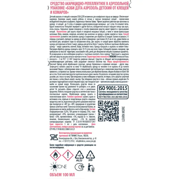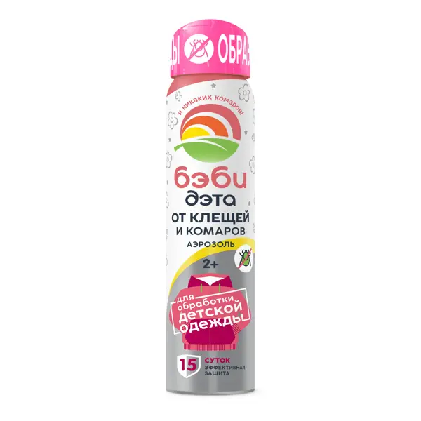 **Аэрозоль «Бэби-дэта»** — это средство от клещей и комаров для применения на открытом воздухе, подходит для обработки одежды детей от 2 лет. Отпугивает кровососущих насекомых и паразитов с помощью запаха. Средство подходит для применения весной и летом, длительность защиты — 15 суток. Вещество относится к F — легковоспламеняющееся. Объем — 100 мл. Страна производства — Россия. ### Использование - Разложить или развесить одежду и снаряжение на открытом воздухе. - Баллон встряхнуть в течение 2-3 секунд, затем распылить на одежду до легкого ее увлажнения с расстояния 20-25 см. - Баллон необходимо держать на вытянутой руке, направляя струю по направлению ветра. - Для защиты от клещей время обработки комплекта одежды не более 2-х минут (25 секунд/м²). - Особенно тщательно следует нанести средство на области вокруг щиколоток, коленей, бедер, плечевого пояса. - После обработки одежду следует просушить и надеть на нижнее белье. - Повторную обработку следует провести через 10-15 суток и