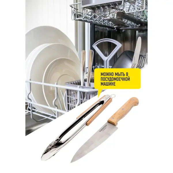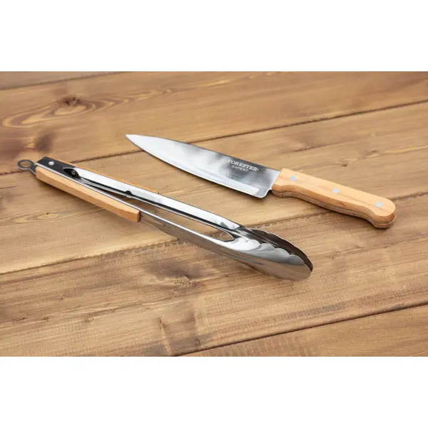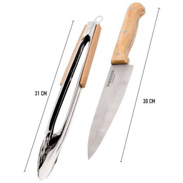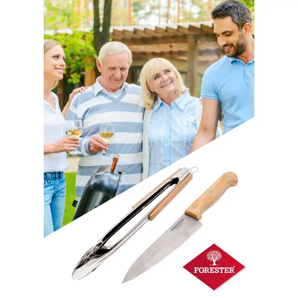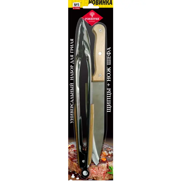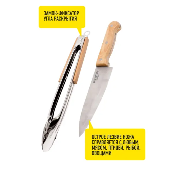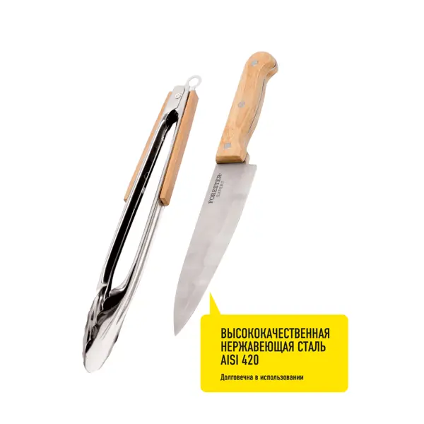 **Набор для гриля универсальный Forester** обеспечивает простоту и удобство приготовления блюд. Щипцы оснащены замком для фиксирования угла открытия. Острое лезвие ножа прекрасно справляется с любыми по твердости продуктами. Изготовлен из качественной нержавеющей стали. ### Особенности: - материал изготовления рукояток — дерево; - подходит для мытья в посудомоечной машине.