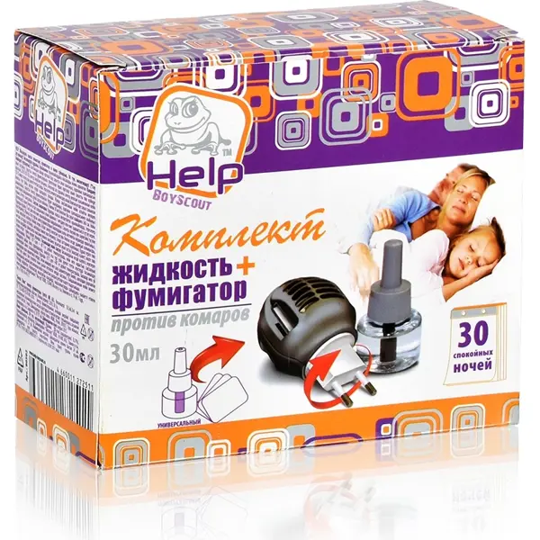**Комплект от комаров Boyscout Help фумигатор и жидкость** — готовый набор для уничтожения насекомых в помещении. Включает в себя электрофумигатор улучшенной модели и двухкомпонентный жидкий репеллент во флаконе для нагревания. ### Преимущества - До 30 ночей действия (1 ночь — 8 часов). - Фумигатор с керамическим элементом для равномерного нагрева, индикатором работы, поворотной вилкой для адаптации под вертикальные и горизонтальные розетки. - Работа при открытом окне. - Отсутствие запаха.