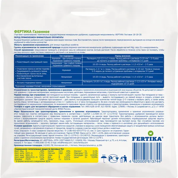 **Удобрение Фертика «Ремонт газона»** способствует быстрому оздоровлению и восстановлению зелени. Относится к классу комплексных водорастворимых минеральных удобрений, содержащих микро- и маркоэлементы. Благодаря повышенному содержанию азота, а также присутствию серы, молибдена и других питательных веществ стимулирует газон к быстрому наращиванию зеленой массы при подсеве, после протаптывания либо при иных повреждениях. Помогает газону быстрее прижиться, стать гуще и обрести более насыщенный цвет. Подходит для всех видов газонных трав.