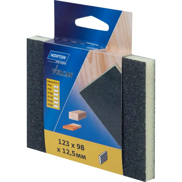 **Губка абразивная Norton** предназначена для ручной шлифовки поверхностей из дерева и металла. Абразивный слой состоит из твердых угловатых кристаллов карбида кремния. Шлифовальный инструмент на основе мягкой пористой губки имеет две рабочие поверхности с зернистостью P60 (для первой грубой шлифовки). Размер — 98 × 123 мм. Во время работы нужно использовать средства индивидуальной защиты: очки, перчатки, маску или респиратор. Губка подходит только для сухой шлифовки. ### Преимущества губки - Гибкая — позволяет качественно обработать детали с рельефной поверхностью, отшлифовать сложные профили, резьбу по дереву, снять краску в углублениях. - Кристаллы карбида кремния не имеют острых граней, как у абразива из оксида алюминия, поэтому создают более гладкую поверхность и лучше удаляют ворс с МДФ. - Удобные для руки размер и форма.