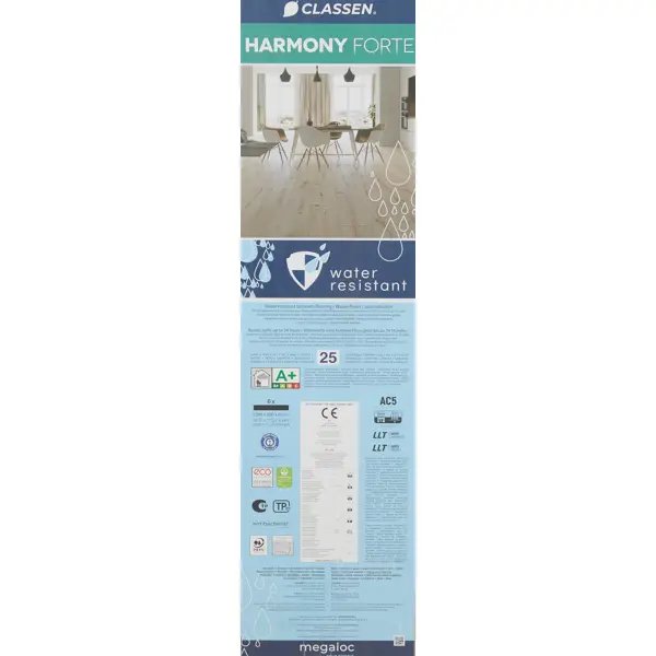 [Читайте больше о Ламинате](/advice/napolnye-pokrytiya/kak-vybrat-laminat/) Ламинат **Classen Harmony Forte 4V Дуб Дорадо** 33 класса с износостойкостью АС5 предназначен для коммерческих объектов с высокой проходимостью и жилых помещений. Отличается большей (282 мм) по сравнению со стандартной шириной доски, что является ее интересным преимуществом. Наилучшее предложение для просторных, открытых интерьеров, благодаря чему полы становятся визуально больше и просторнее. Поэтому их стоит использовать на больших поверхностях. Интересная цветовая гамма гарантирует исключительный характер полов в каждом интерьере, тем самым подчёркивая их элегантность и красоту. ### Особенности: - Безопасно для здоровья и природы. Этот товар имеет экологический сертификат, который гарантирует, что в составе нет веществ, оказывающих негативное влияние на здоровье человека и окружающую среду. - Отличает наличие четырехсторонней фаски благодаря которой все панели четко выделяются, подчеркивая красоту оригина