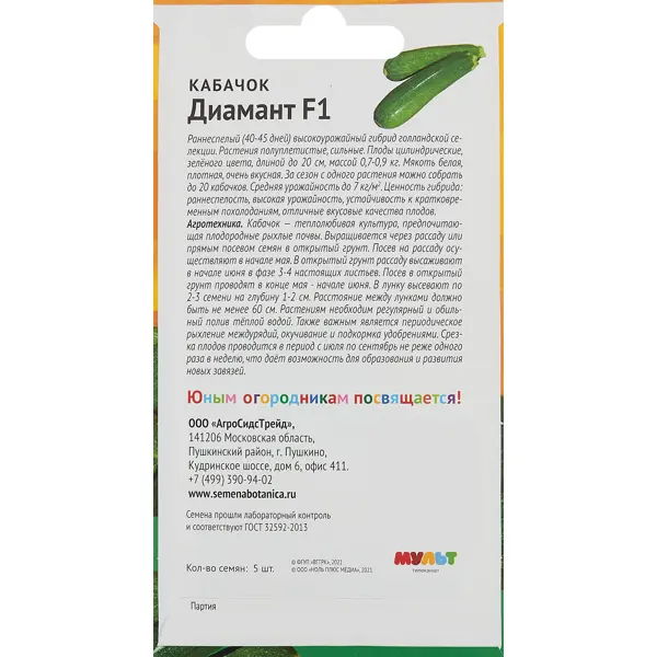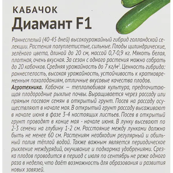 Ранний высокоурожайный гибрид голландской селекции. Растения здоровые, сильные, открытого типа. У гибрида развиваются сильные растения, устойчивые к холоду. Плоды цилиндрические, выровненные, длиной 18-20 см. Цвет от средне- до темно-зеленого. На кустах формируются однородные плоды, имеющие темную зеленую кожицу и сочную белую мякоть. За сезон на растении могут образоваться до 20 кабачков. Подходит для весенней, летней и осенней культуры. Рекомендуемая густота стояния - 15 тыс. растений/га. Норма высева 2-3 кг/га. Молодые плоды пригодны для употребления в пищу сырыми, более зрелые хороши в печеном и жареном виде. **Агротехника:**