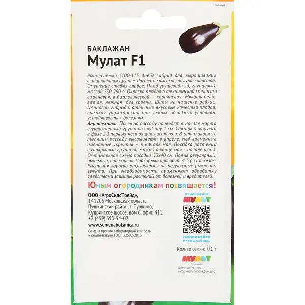 **Баклажан Мулат** Раннеспелый (105-115 дней) гибрид для выращивания в защищенном грунте. Растение высокое, полураскидистое, опушение стебля слабое. Плод грушевидный, глянцевый, длиной до 18см, массой 230-260г. Окраска плодов в технической спелости ярко-сиреневая, в биологической – коричневая. Мякоть беловатая, нежная, без горечи. Шипы на чашечке редкие. Урожайность 7,5-8,0 кг/кв.м. **Ценность гибрида:** хорошая завязываемость плодов, высокая урожайность при любых погодных условиях, отличные вкусовые качества, устойчивость к болезням. Используют в кулинарии, для маринования и консервирования, приготовления икры. **Агротехника:** Посев на рассаду в середине февраля – начале марта в увлажненный грунт на глубину 1-1,5см. Сеянцы пикируют в фазе первых настоящих листьев. Рассаду высаживают в конце мая по схеме 40*40см. Полив регулярный под корень. Подкормки проводят 4 -5 раз за сезон. Рыхление поверхностное, чтобы не повредить корни. За вегетацию баклажаны дважды слегка окучивают. При не