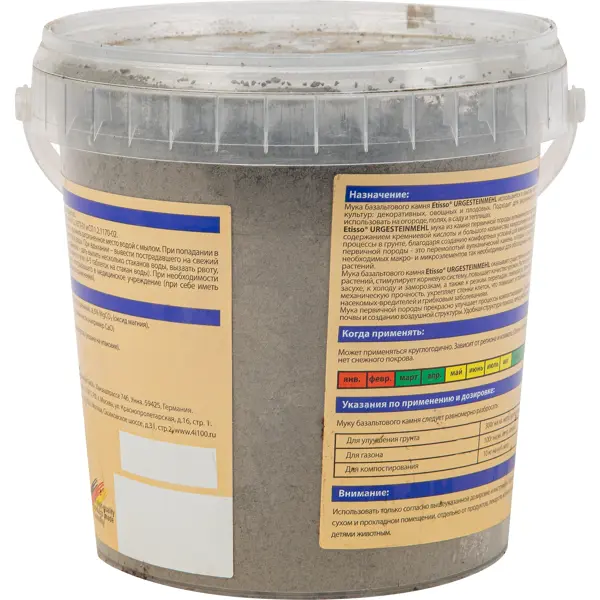 **Базальтовая мука Etisso** предназначена для использования в качестве удобрения различных плодовых, овощных, зерновых культур. Изготовлена из камня первичной породы вулканического происхождения, богатого витаминами и микроэлементами. Стимулирует обменные процессы в субстратах, обогащает почвы, повышая качество урожая и активный прирост биомассы. ### Особенности: - входящий в состав кремний придает растениям механическую прочность, устойчивость к жаре и засухе, заморозкам; - обеспечивает защиту от насекомых и грибковых болезней; - способствует разрыхлению и лучшей аэрации субстратов; - масса базальтовой муки — 2 кг.