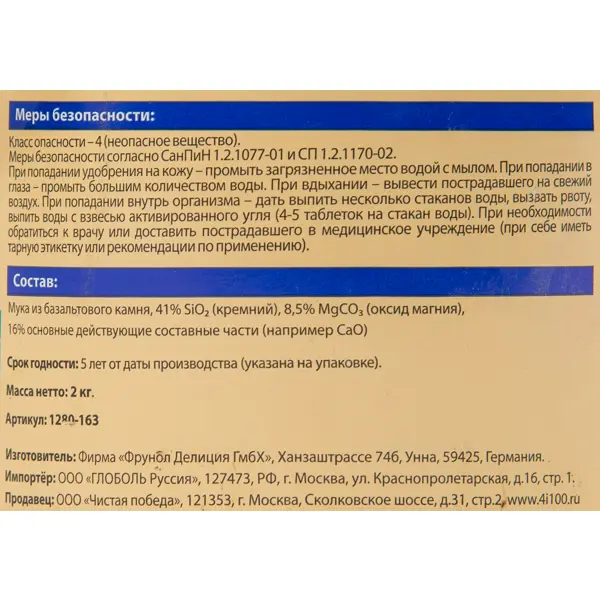 Мука из базальтового камня 41% SiO2 (кремний), 8,5% MgCO3 (оксид магния), 16% основные действующие составные части (например CaO)