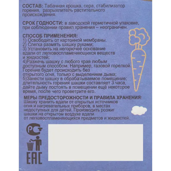 **Серно-табачная шашка Джин 160 г** предназначена для обработки овощехранилищ, погребов, хозяйственных помещений, сотовых хранилищ, теплиц. Обрабатываются с целью дезинфекции и борьбы с бактериальными инфекциями, плесенью, грибками, насекомыми-вредителями и грызунами. Самым эффективным средством обработки помещений от всевозможных паразитов, является окуривание, т.к. дым, состоящий из паров никотина, сернистого ангидрида и угарного газа, проникает в самые труднодоступные места, не оставляя паразитам никаких шансов, гарантированно уничтожает блох, клещей, вшей, мух, плодовую моль, а также грибков и других опасных микроорганизмов.