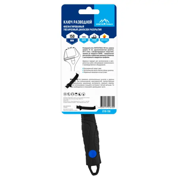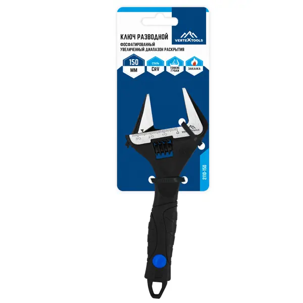 **Ключ разводной Vertextools** применяется для монтажа и демонтажа крепежных элементов, отвинчивания и завинчивания гаек, болтов, винтов и других резьбовых соединений, имеющих шестигранный профиль. Актуален при выполнении различных слесарно-монтажных работ. Изготовлен из хромованадиевой стали. Имеет тонкие губки. ### Особенности: - длина — 150 мм; - максимальный захват — 34 мм; - ширина губок — 10.5 мм; - после использования необходимо протирать инструмент ветошью.