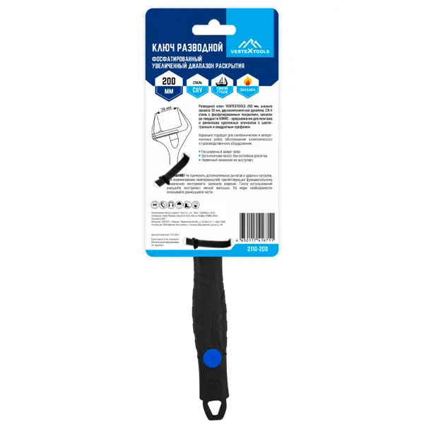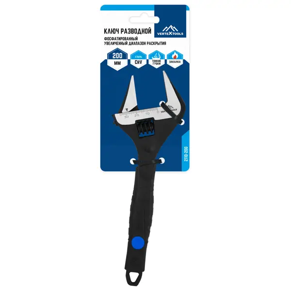 **Ключ разводной Vertextools** применяется для монтажа и демонтажа крепежных элементов, отвинчивания и завинчивания гаек, болтов, винтов и других резьбовых соединений, имеющих шестигранный профиль. Актуален при выполнении различных слесарно-монтажных работ. Изготовлен из хромованадиевой стали. Имеет тонкие губки. ### Особенности: - длина — 200 мм; - толщина губок - 6 мм; - максимальный захват — 36 мм; - после использования необходимо протирать инструмент ветошью.
